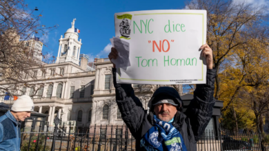 Migrantes repudian reunión del alcalde Nueva York y el zar de Trump para la frontera.