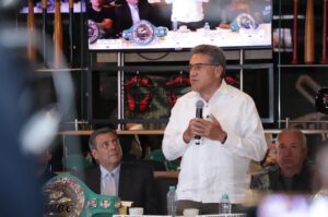 CDMX 06 Agosto de 2025.- Se oficializó la función de box internacional en Altamira en el tradicional Martes de Café con el Lic. Mauricio Sulaiman, Presidente del Consejo Mundial de Boxeo, en la Ciudad de México, donde estuvo presente el alcalde de la urbe industrial, Armando Martínez Manríquez.